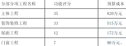 解析 教材P328 价值系数=功能系数/成本系数;本题只需找出成本比重偏高的分部分项工程(即价值系数最低的项),并不需要精确计算,可用“功能评分/预算成本”进行估算。主体工程估算结果0.043、装饰装修工程估算结果0.064、屋面工程估算结果0.070、门窗工程估算结果0.078,由此可见,相对于单位功能评分值主体-工程的成本过高。