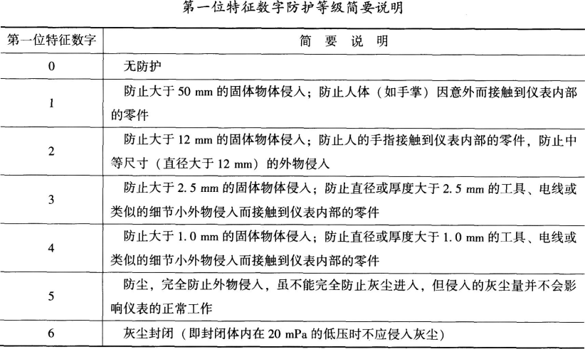 解析 IP:代码字母(国际防护),IP后跟随两个字母用来说明防护的等级。 (1)第一位特征数字(数字0~6或字母X),表明设备抗微尘的范围,或者是人们在密封环境中免受危害的程度。代表防止固体异物进入的等级,最高级别是6。 (2)第二位特征数字(数字0~8或字母X),表明设备防水的程度。代表防止进水的等级,最高等级是8。 A:附加字母(字母A、B、C、D)。 H:补充字母(字母H、M、S、W)。