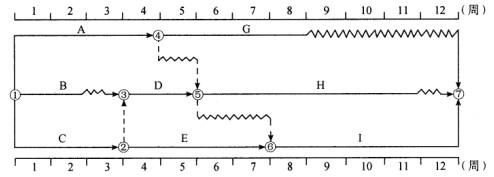 解析 工作A有3项紧后工作G、H、I,应首先计算它们的总时差,然后分别加上工作A与它们的时间间隔,找出其中的最小值,即为工作A的总时差。工作A的自由时差有箭线上波形线水平投影的长度决定。A的总时差和自由时差分别为2周和0周。