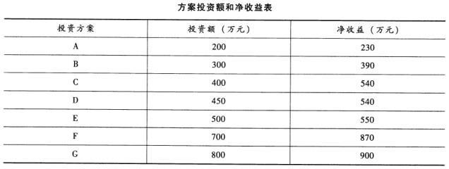 现有A、B、C、D、E、F、G七个互相独立的投资方案,各方案的投资额和一年后的净收益如下表所示。方案的寿命期都为一年,一年后的净残值为零,各个方案都是不可...