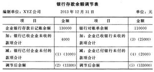 问题 XYZ公司2013年12月31日银行存款日记账为130000元,银行对账单的存款余额数为110000元,经过双方逐笔核对后,发现存在以下未达账项:(1)公司因采购材料开出转账支票一张,金额为2000元,公司已入账,但持票人尚未到银行办理转账手续。(2)公司因销售商品收到购货方开来的转账支票一张,金额为5000元,将支票送存银行后公司做收入入账,但是银行尚未办理入账手续。(3)XYZ公司送存银行的某客户转账支票20000元,因对方存款不足而退票,公司未接到通知。(4)公司委托银行代收外地销货款4000元,银行已收款入账,但公司尚未收到收款通知。(5)银行代为支付本月电话费1000元,已入账,但是公司尚未收到付款通知。 要求:根据上述资料,完成以下“银行存款余额调节表”的编制。
