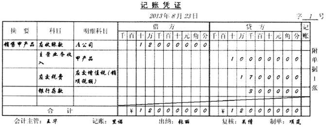 2013年8月23日,向A公司销售甲产品2000件,单价为50元(不含税),销售价款为100000元,代垫运杂费为3000元,货款尚未收到。要求:填制...
