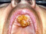 男,41岁,发现上腭前部正中肿物3个月(如图),伴自发性剧痛,近半个月来午后低热。体格检查:上腭切牙孔附近约鸽蛋大小肿物,表面充血,触痛明显,有异味。实验...