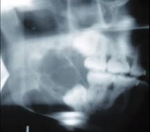 女,32岁,右下后牙龈向外膨隆,后牙渐松动3个月。X线片(如图)示右下颌磨牙区颌骨呈蜂房样改变,病变区牙根呈锯齿状吸收。该病人最可能的诊断是 ( ...