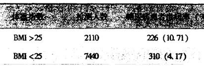为研究45岁以上男性体重指数(BMI) 25者糖尿病患病率是否高于体重指数 25的人群,某医师将资料汇总如下表经U检验,若U值等于2.95,则PA...