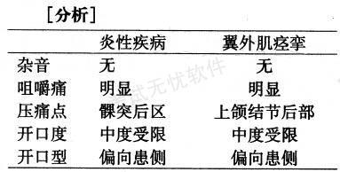 问题 颞下颌关节紊乱病的炎性疾病类的主要症状和翼外肌痉挛相似,唯一不同点是