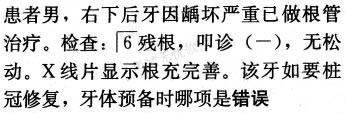 解析 [分析]患牙的强度主要取决剩余牙体组织的量,尽量保存剩余牙体硬组织是桩核冠修复中的基本原则。根据所选择的最终全冠修复体的要求对剩余牙体组织进行预备,然后去除龋坏、薄壁等,其余的则为要求保存的部分。这部分剩余牙体与核一起形成全冠预备体。
