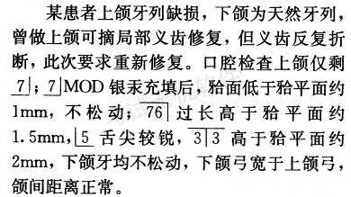 解析 [分析]修复前的准备应包括调下前牙切缘、调低过长牙,修整余牙外形,调过锐牙尖、牙嵴,形成良好的曲线。 工作尖应排在牙槽嵴顶上,出现上颌牙槽嵴吸收过多、过少的特殊情况时,也可考虑排成反,防止上颌颊侧牙槽嵴加速吸收。