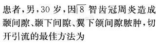 选项 A.于上颌结节外侧前庭沟切开 B.于翼下颌韧带内侧切开 C.于下颌角下方切开 D.于升支后缘切开 E.于颞部及下颌角下方切开并贯通引流