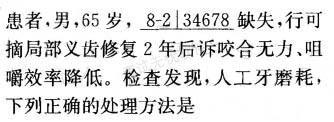 A.与患者解释修复效果不佳,建议重做 B.若人工牙广泛性磨耗,可用自凝塑料在口内直接加高恢复正常的咬合关系 C.若人工牙广泛性磨耗,应在人工牙面咬蜡...