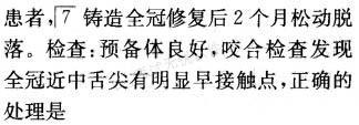 选项 A.调磨对颌牙牙尖 B.调磨对颌牙早接触点 C.使用更优质的粘结剂 D.调磨全冠上的早接触点,抛光后重新粘固 E.重做全冠