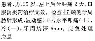 解析 急性牙周脓肿的治疗原则是止痛、防止感染扩散以及使脓液引流。当脓液形成,出现波动时,可根据脓肿部位及表面黏膜的厚薄,选择从牙周袋内或牙龈表面引流。但尚未出现波动感时,过早切开引流会造成伤口出血过多和疼痛。急性牙周脓肿只去除大块龈上牙石,不宜做彻底的龈上洁治,以免感染扩散。
