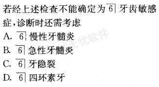 患者,男,38岁,自觉右下第一磨牙咀嚼时咬到某一处有明显酸痛,不咬合时无疼痛,今晨咬硬物时又出现同样症状,进冷热食时,无明显痛感。