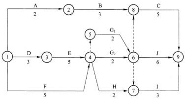 某施工单位承担一井下装载硐室的掘进施工任务。所编制的施工进度计划见下图,图中箭线上方为工序的名称,下方为工序的时间,单位:周。在工程施工到第4周结束时,业主要求施工单位将该硐室的混凝土基础一并完成,需增加一道现浇混凝土基础施工工序J,该工序J应在工序G完成后开始,在工程完工前结束,时间为6周,且总工期不变。施工单位及时调整了进度计划,将工序G分成两组同时施工,每组施工时间2周。