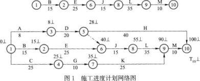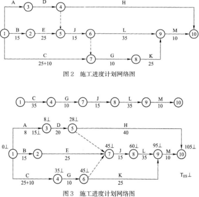 解析 本案例主要提供制定网络计划图的实例。通过塔吊使用的限制,变化工序间的结构关系,熟悉网络计划的制订方法,了解一些相关概念的用途。??1.经计算计划工期为100d,关键线路为B、E、J、L、M。如图1所示。? 其中G工序的最早开工时间ESG=25,最迟开工时间三LSG=55,总时差TFG=30;J工序的ESJ=40,LSJ=40,TFJ=0。? 采取先G后J的塔吊工作顺序,塔吊正常进场时间应为第26日晨,但G工作完成后等待J工作开始塔吊闲置5d,因此塔吊自第31个工作日进人现场工作后恰好与J工作开始日期衔接。塔吊进入现场的合理时间为第30日晚或第31日晨。? 2.先J后G使用塔吊的工作关系图如图2所示。? 3.C工作延误1Od时,经计算总工期为105d,与原工期相比延误5d,如图3所示。此种情况下关键线路为:C、G、J、L、M。? 4.C工作延误10d,塔吊工作顺序为先G后J时,L工作位于关键路线上,将其工作时间由35d压缩为30d,总工期仍为100d,所以此措施可行。? 对于施工单位赶工费的要求,业主认为:1)压缩工期5d后的整个工期与原计划100d相比无变化;2)施工单位没有具体列出赶工多支的费用,可以认为J工作压缩工期是属于对施工单位施工组织设计的一项合理性要求的实施;3)因C工作延误付给的45000元属于综合损失,包含了施工单位的部分赶工要求;综上理由,决定赶工费不予补偿。? 在C工作延误的条件下,塔吊采取先G后JXi作顺序时,因为不影响G、J;t间的关系,故塔吊闲置时间为C、G总时间与B、E总时间的差:(25+10+10)-(15+25)=5d,因此需要补偿塔吊闲置费用600元/d×5=3000元。? 由于C工作延误的损失费45000元应予补偿。总计应补偿费用45000+3000=48000元。?