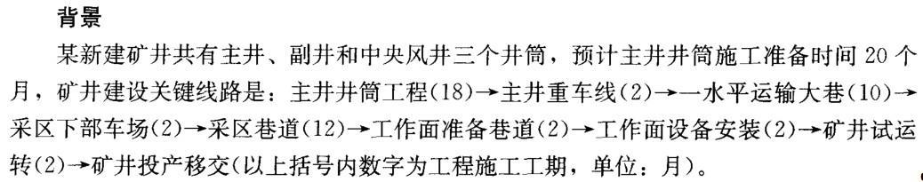 解析 1.矿井建设工期一般由井巷工程关键线路的施工期计算确定,也可根据与井巷工程密切关联的土建和机电安装工程施工期推算,或按主要生产设备定货、到货和安装的时间来进行推算。随着技术和管理方法的进步,在工程实施中关键线路会发生转移,或遇有一些特殊情况,如复杂大型设备的增加,井塔施工占用较长工期等,这时实际工期的确定应根据具体情况考虑。本案例矿井建设总工期可以采用关键线路来进行推算。 2.总工期: 建井工期为: 18+2+10+2+12+2+2+2 = 50 月 建井总工期分别是: 20 + 50 = 70月 3.若副井比主井提前结束到底,这时可能出现的情况较多: 1)主井施工进度正常,矿井建设的关键线路不变,这时矿井建设的工期不会发生变化。副井提前到底可提前进行主副井贯通工程施工工作,可加快井底车场巷道与碉室施工进度。 2)主井施工进度拖延,矿井建设的关键线路不变,这时矿井建设的工期会发生拖延。副井到底不会耽误井底车场巷道与硐室的施工进度。 3)副井比计划工期提前较多,在完成主副井贯通工程施工后主井仍没有到底时,这时可提前安排原关键线路上主井重车线工程施工,争取因为副井赢得的时间,推进井下巷道施工。因为是单井筒担负井下施工,因此受运输能力、通风条件等因素的限制。