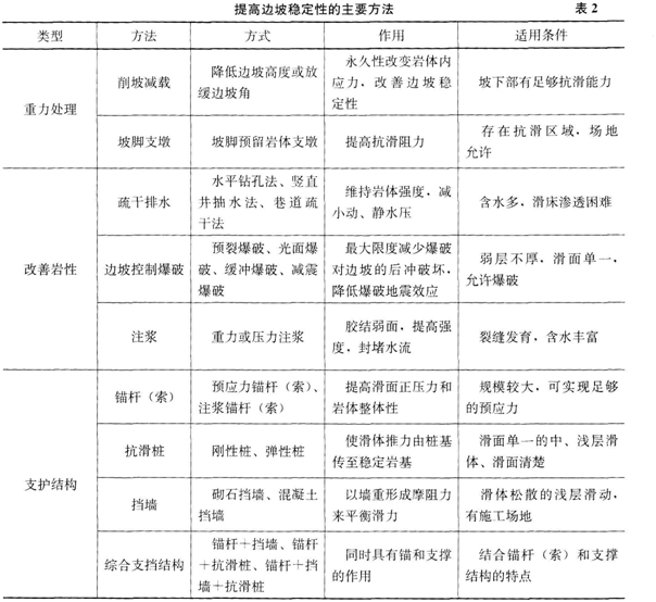 解析 本题考核的是提高边坡稳定性的主要方法。提高边坡稳定性的主要方法见表2。