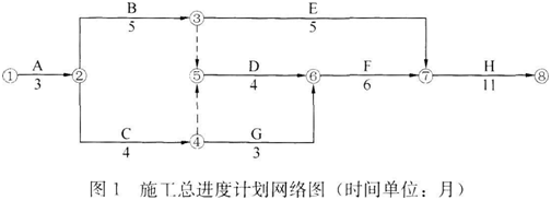 解析 1.施工总承包单位计划工期能满足合同工期要求。为保证工程进度目标,施工总承包单位应重点控制①→②→③→⑤→⑥→⑦→⑧施工线路。 2.监理工程师做法妥当。 理由:专业分包单位与建设单位没有合同关系,分包单位不得与建设单位和监理单位发生工作联系,所以,拒收分包单位报送专项施工方案以及对总承包单位下达停工令是妥当的。 施工总承包单位做法不妥当。 理由:因为专业分包单位与建设单位没有合同关系,监理单位不得对分包单位下达停工令;而总承包单位与建设单位有合同关系,并且应对分包工程质量和分包单位负有连带责任,所以施工总承包单位拒签停工令的做法是不妥当的。 3.事件2中,施工总承包单位不可索赔赶工费。 理由:由于G工作的总时差=29-27=2个月,因设计变更原因导致G工作停工1个月,没有超过G工作2个月的总时差,不影响合同工期,总承包单位不需要赶工都能按期完成,所以总承包单位不能索赔赶工费。 4.事件3中,流水施工调整后,H工作相邻工序的流水步距=min[2,1,2]=1个月。 H工作的工期=(3+5-1)×1=7个月,工期可缩短=(11-7)=4个月。 绘制调整后H工作的施工横道图(如图5所示)。
