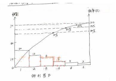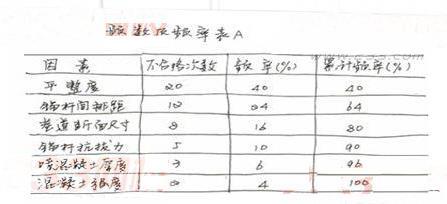 解析 1、该工程为煤矿一主要运输大巷,混凝土支护厚度质量合格标准是应达到设计要求,局部的厚度不应小于设计规定的90%;锚杆间排距误差±100mm。 2、A喷射混凝土厚度检测点8个,设计厚度120mm,按质量标准局部不得小于90%,即局部不得小于120mm×90%=108mm。A点检测点数8 个,其中第一点厚度100mm为不合格点,其他7个点均合格,合格率7/8=87.5%。根据《煤矿井巷工程质量验收规范》GB50213-2010规 定,合格率大于75%,且其余测点不影响安全使用。为合格。 锚杆间排距测点8个,第五、六两测点不合格,合格率6/8=75%,大于规定70%,且其余点不影响安全使用,为合格。 3、(1)按照不合格出现次数的大小进行排列,并计算累计频率,如下表A: 根据表A绘制排列图如下 根据排列图可以看出影响质量的主要因素是喷混凝土平整度、锚杆间排距、巷道断面尺寸,其累计出现频率在0-80%之间,次要因素为锚杆抗拔力,因为其累计频率在80%-90%之间;一般因素是喷混凝土厚度、混凝土强度,因为其累计频率在90%-100%之间。 4、由于水泥、骨料和添加剂均无质量问题,因此混凝土用量大大超定额主要是人为操作问题,其原因可能有:(1)配合比不当,(2)回弹量过大,(3)混凝土的粘接效果不好,喷层脱落等。