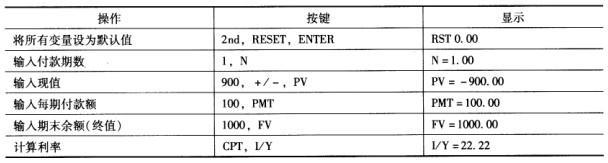 解析 一般而言,长期债券价格较短期债券价格对市场利率变化更敏感,当市场利率上升时,两者价格都会下降,但是长期债券价格下降幅度更大。 因为平价发行的每年付息一次的债券,其到期收益率等于票面利率。因此,到期收益率为10%。 根据债券定价公式,该债券的价值为:V=1000*10%/(1+8%)+1000/(1+8%)=1019(元) 根据计算公式:900=[100/(1+y)]+[1000/(1+y)],y=22%,或者用财务计算器。使用德州仪器BAIIPLUS计算器,操作步骤及计算结果如下: 根据债券的定价公式可得:V=100/(1+12%)+100/(1+12%)2+100/(1+12%)3+100/(1+12%)3=952(元)