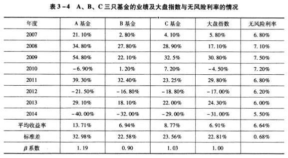 问题 共用题干 刘薇整理了A、B、C三只基金2001年以来的业绩情况,并将其与大盘指数和无风险利率进行了对照,如表3-4所示。 根据案例回答1~2题。