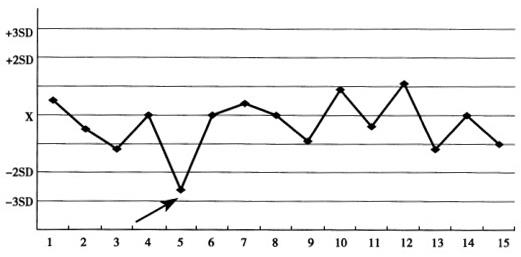 下列图形中箭头所指的“点”违背了West-gard基本质控规则中的A:12s B:13s C:22s D:R4s E:10Xbar