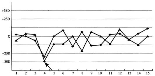 以2种浓度的质控物对某检验项目进行室内质控时,下列图形中箭头所指的“点”违背Westgard多规则质控方法质控规则中的A:41s B:13s C:22...