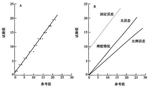解析 回收实验用于评估实验方法,正确测定在常规样本中加入的被测物量的能力,通过测定比例系统误差,对实验方法的准确度进行评价。系统误差与随机误差构成总误差。比例系统误差和固定系统误差是系统误差的两种类型。比例系统误差大小是分析物浓度的百分数;固定系统误差指的是即使分析物浓度改变但仍处于同一大小。可通过绘制试验方法的结果与“真值”之间的关系图清楚地显示(左图:显示随机误差;右图:显示比例系统误差和固定系统误差)。
