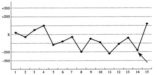 下列图形中箭头所指的“点”违背了West-gard基本质控规则中的A:41s B:13s C:22s D:R4s E:10Xbar