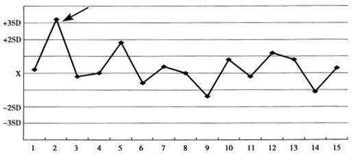 下列图形中箭头所指的“点”违背的West-gard基本质控规则是A:12s B:13s C:22s D:R4s E:10Xbar