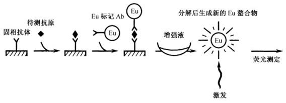 解析 由图可见为固相抗体捕捉待测抗原,然后用铕标记的抗体与之结合,在增强剂的作用下,铕解离为新的微粒,在340nm激发光照射下,游离出的铕螯合物可发射613nm荧光,经仪器检测得到结果。