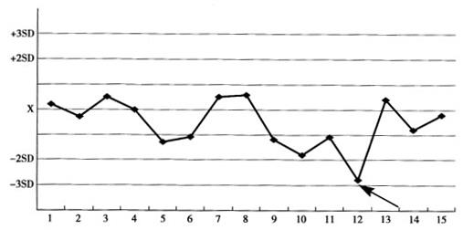 以下图形中箭头所指的“点”违背Westgard基本质控规则的是A:41s B:13s C:22s D:R4s E:10Xbar