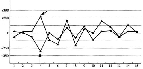 问题 以两种浓度的质控物对某检验项目进行室内质控时,下列图形中箭头所指的“点”违背Westgard多规则质控方法的是