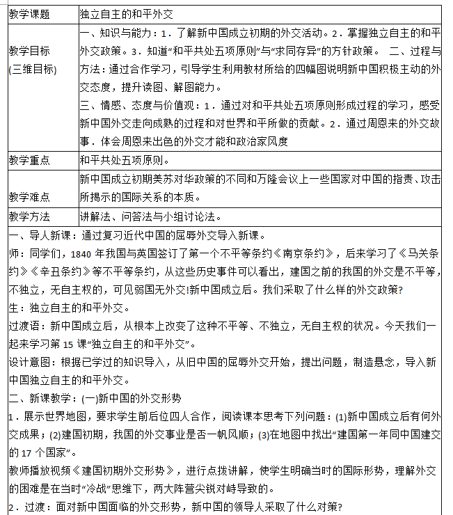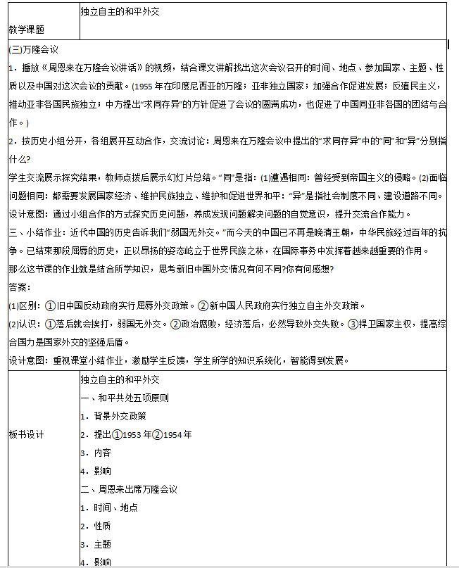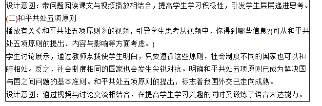 问题 阅读下列材料,回答相关问题: (1)《义务教育历史课程标准》规定:掌握独立自主的和平外交政策;了解新中国成立初期的外交活动等基本史实。 (2)课文摘录 1953年底.我国政府同印度就两国西藏地区的关系问题进行谈判。周恩来在接见印度代表团时,首次提出按照互相尊重领土主权、互不侵犯、互不干涉内政、平等互惠、和平共处五项原则.作为处理两国关系的原则。第二年,周恩来访问印度和缅甸,分别与印度总理尼赫鲁、缅甸总理吴努发表联合声明。双方一致同意以和平共处五项原则作为指导中印、中缅两国关系的基本原则。在三国总理的积极倡导下,和平共处五项原则在国际上产生深远影响,被世界上越来越多的国家所接受,成为处理国与国之间关系的基本准则。 1955年.众多亚非独立国家的首脑,聚集在印度尼西亚的万隆,举行第一次没有殖民主义国家参加的亚非国际会议,讨论保卫和平、争取民族独立和发展民族经济等共同关心的问题。 会上。帝国主义国家挑拨一些国家的代表当着中国代表的面攻击共产主义,甚至怀疑中国对邻国搞“颠覆”活动。针对帝国主义破坏会议的阴谋和各国间的矛盾、分歧,中国代表团团长周恩来提出“求同存异”的方针,促进了会议的圆满成功,也促进了中国同亚非各国的团结与合作。 要求:根据课程标准要求和课文内容,设计出相关的教学过程,包括教学环节、教师活动和学生活动,并说明设计意图。