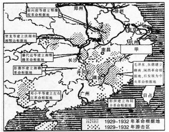 下图是“1929--1932年间的农村革命根据地示意图”,其中甲处的创建人之一是( )。 A.邓小平 B.彭德怀 C.方志敏 D.滕代远