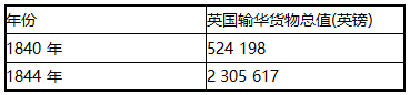 解析 由表格当中的数字变化我们可以得出的信息是由1840年至1844年英国输华货物总值在四年之内激增。结合时间1840一1844年,中英结束第一次鸦片战争,而选项中只有A项才是导致表格数字变化的原因。