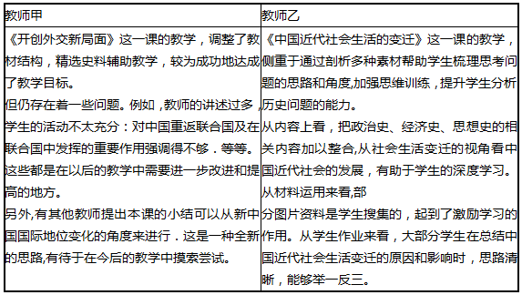 解析 (1)教师甲:着重对课堂教学活动的设计、组织进行了反思,认为在授课过程中,教师讲述多,学生活动少。并且从专业水平进行了反思,认为对中国重返联合国及在联合国中发挥的重要作用强调不够。 教师乙:着重从专业水平方面进行了反思,从内容上、材料运用上反思。同时,从学生作业方面对教学方法进行了反思。 (2)教师甲、乙都没有从教育观念和教师角色定位方面进行反思。教师乙在教学反思过程中,应该积极争取同行和专家的支持,加强交流与合作,充分借助别人的思想资源,使自己的反思更有效、准确、到位。同时,教师甲、乙在反思过程中要加强对比方法的应用,通过与曾经的自己以及别人的对比,找出缺陷和不足。 (3)①对自身教育观念的反思,即用新的教育理念来反思自己的教学行为,发现缺陷和不足,以求改进。 ②对教师角色地位的反思,即强调师生之间的人格是平等的,应当建立起一种平等、民主、互助、和谐的师生关系。 ③对专业水平的反思,即对授课过程中所传授的知识是否准确可行进行思考。 ④对教学方法的反思,即对课堂教学活动的设计、组织是否有效进行检讨。