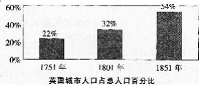 下图显示1751~1851年英国城市人口占总人口比例不断增加。导致这种变化的相关因素是()。 ①农村自然灾害频发迫使大量农民涌容易城市 ②工业革命...