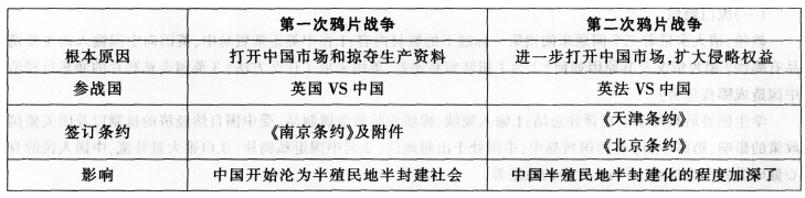 解析 教学目标 1.知识与能力 重点识记两次鸦片战争的历史背景、大致经过、签署的各项条约及历史影响。培养学生辨析史料,获取有效信息能力,增强学生分析与解决问题能力,提高学生语言表达能力。 2.过程与方法 采用“情景创设——问题提出——探究学习”的课堂教学模式,运用以学生为中心的教学思想,把“以任务为中心”的活动作载体,在研读与阐释史料、问题探究、历史比较过程中实现本课教学目标。 3.情感、态度与价值观 (1)通过学习林则徐等爱国志士的反抗侵壮举,培养爱国主义情感及正确的人生价值观与历史责任感,珍惜和平生活;(2)了解两次鸦片战争的历史背景及不平等条约的签订,明白“落后就要挨打”“御侮必先自强”的道理,进而确立积极进取的人生态度,树立国民对国家的历史责任感。 教学重难点 教学重点:两次鸦片战争爆发的原因与影响。 教学难点:禁烟运动与鸦片战争关系、“半殖半封”社会性质的确立。 教学过程 一、导入新课 教师通过多媒体教学设备播放一段编辑好的《鸦片战争》视频,营造气氛,将学生的注意力带人160多年前战争情景中,为本节新课教学打好基础。 教师:刚才大家看的短片是有关于哪一场战争 反映了什么事件 接下来就让我们带着问题一同学习本课的内容。 二、新课讲授 (一)虎门销烟 教师:请大家带着三个问题来阅读第一标题下的教材内容:1.在中英正常贸易中,英国向中国输入的主要商品有哪些 销售情况及其原因如何 2.为了扭转贸易逆差,英国采取了什么方法 3.英国走私鸦片的罪恶行径给中国造成哪些危害 学生回答后教师予以点评并总结:1.输入呢绒、棉纺织品和金属制品。受中国自然经济的抵制以及闭关锁国政策的影响,销路不畅。在两国贸易中,中国处于出超地位。2.向中国走私鸦片。3.白银大量外流,中国人民的身心健康受到严重摧残,不利于社会的稳定等。 教师用多媒体展示《英国输入中国鸦片激增表》、林则徐向道光帝的上书。 教师:正是鸦片的输入给中国造成如此巨大的危害,道光帝任命林则徐前往广东主持禁烟。但是不法英商为扭转正常贸易中逆差带给英国的损失,维持走私鸦片的利润。鼓动英国政府诉诸武力,因此有人说:“若没有林则徐禁烟运动,就不会有中英鸦片战争”。对此有何看法 (二)鸦片战争爆发的原因及影响 1.鸦片战争爆发原因 教师利用课件展示相关的阅读材料及图片,请学生结合材料尝试总结鸦片战争爆发的原因。学生回答后教师予以总结:根本原因是英国为打开中国市场,掠夺生产资料;直接原因是虎门销烟。 2.战争经过 教师用多媒体演示《鸦片战争形势动态示意图》,通过对图例的分析引导学生了解鸦片战争的大致经过。 教师:在鸦片战争中,中国涌现了许多英勇的爱国将领,又处于天时、地利优势,但由于清政府腐朽、落后,妥协投降,结果争从清政府屈膝段降,中国败而结束。 3.中英《南京条约》的签订 教师展示《南京条约》表格,引导学生逐条分析危害,最后指出鸦片战争对中国社会的最大影响是社会性质的变化。 教师:鸦片战争是否就此停止 让我们继续看下去。 (三)战火再燃 教师:当英国商人幻想着在中国获得巨大商业成就时,冷冰冰的结果打破他们的幻想。 教师出示(1853年中国和洪都拉斯对英国棉纺织品的消费量》,引导学生归纳出鸦片战争后英国商品并没有真正打开中国市场,而是出现了商品滞销现象。 教师:你们知道当时西方国家是通过什么方式来扭转这种局面的吗 学生思考并回答,教师归纳:列强起初企图通过修约来扩大侵权益,实现倾销商品的目的。当修约要求遭到清政府拒绝后,战争成了唯一的选择。第二次鸦片战争不可避免地发生了。 教师结合课件引导学生分析教材,了解战争大致经过和《天津条约》《北京条约》的内容,明确条约的危害,并进一步引出战争的重大影响,即中国半殖民地半封建化的程度加深。 设计意图:创设问题情景,让学生自主学习探究解决,教师点评,培养观察能力,提高归纳、提取有效信息能力。 三、巩固练习 教师出示课前准备的有关本课重难点知识的练习试题。请学生在规定时间内作答。作答时教师予以巡回指导。 设计意图:通过演练试题了解学生对本课内容的掌握情况,做到查缺补漏。 四、本课小结 设计意图:回顾本课知识要点,加深记忆,巩固理解。 五、课后作业 教师布置一篇小论文“鸦片战争中,中国的战败能否避免 ”请学生课后结合材料予以分析论述。形成一篇300字左右的论文。 设计意图:拓展学生的知识视野,增强动手实践能力。