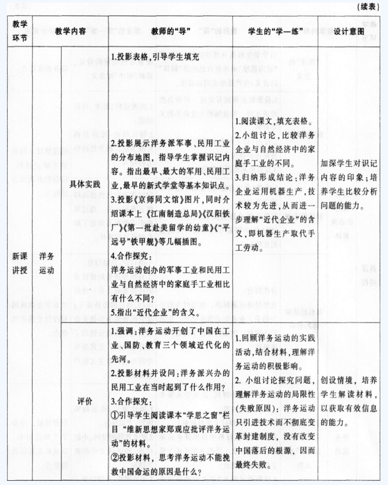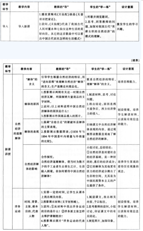 问题 根据下列材料设计教学片段。 (1)《普通高中历史课程标准(实验)》:简述鸦片战争后中国经济结构的变动和近代民族工业兴起的史实,认识近代中国资本主义产生的历史背景。 (2)课文摘录: 列强大量收购中国的农副土特产品,其中以丝、茶为大宗。它们操纵着丝、茶市场,使中国丝、茶生产服从于国际市场的需要,日趋商品化。丝、茶等农产品大量出口,减少了它们在农业经济中的自给自足成分。这在客观上促进了中国商品经济的发展,也同时瓦解着中国社会的自然经济。 鸦片战争以后,外商陆续在通商口岸私自设厂。受外商企业丰厚利润的刺激.受洋务派引进西方先进生产技术的诱导,一些官僚、地主、商人,开始投资创办近代企业。 要求:根据课程标准要求和课文内容,设计出相关的教学过程,包括教学环节,教师活动和学生活动,并说明设计意图。