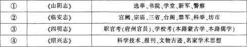 解析 由①中的“选举”“新军”可知应为辛亥革命前后,湖北新军发动武昌起义和临时约法确立选举原则的史实,故应为民国时期的浙江地方志;由②中的“禁军”即可知此应为宋朝的浙江地方志;由③中的“本路蒙古学”即可知此应为元朝的浙江地方志;由④的目录可知此时的政府注重科技和思想文化的发展,应为当代浙江的地方志,B项符合题意。