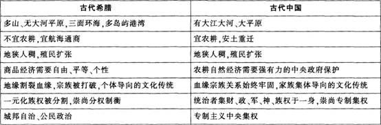 下面是某教师授课时,对古代希腊和古代中国政治制度所作的比较: 师:从上表可知,古代希腊和古代中国由于自然地理条件的不同,社会经济活动的内容也因此不同...