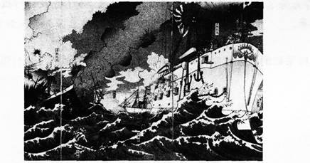 解析 通过观察图片可知反映的是一场海战。观察图片细节,为一艘战舰撞向日舰时沉没。结合史实可知,图片反映的是甲午中日战争中致远舰勇战日舰松岛号的历史场景。