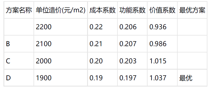 问题 某高速公路扩容改建,由原双向四车道改建为双向八车道,合同文件约定半幅封闭,半幅施工。有五个变更设计方案,经有关专家对上述方案进行技术经济分析和论证,得出了各方案的功能重要性评分表,以及方案功能得分和单方工程费用)。 问题: (1)计算功能重要性系数。 (2)计算功能系数、成本系数、价值系数,选择最优设计方案。 (3)在对施工单位提出的施工方案进行技术经济分析时,监理人提出将评价指标分为:工程成本、工程工期、工程质量和其他等四个方面,请将这四个方面的指标进一步细化。