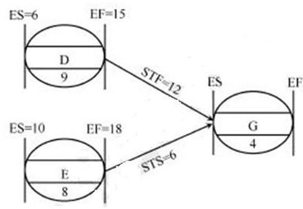 在单代号搭接网络图中,工作G的持续时间为4天,紧前工作有D、E工作。工作D→G之间的搭接关系为STF=12天,工作E→G之间的搭接关系为STS=6天,D、...