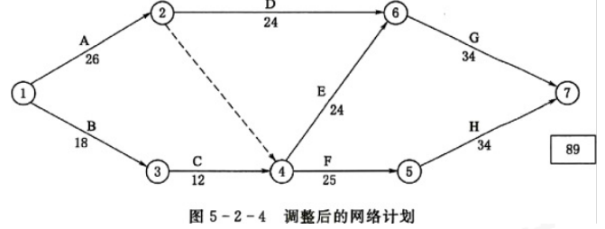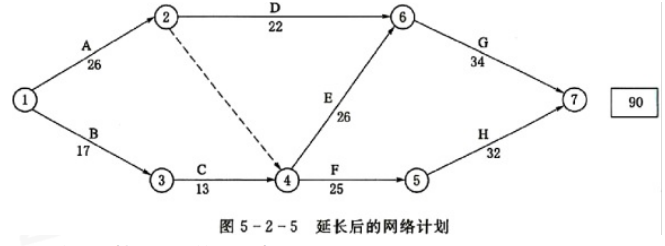 解析 1.网络计划图5-2-3的关键路线是B-C-E-G或1-3-4-6-7。 网络计划图5-2-4的关键路线是B-C-F-H或1-3-4-5-7。 2.承包人要求延长工期18天不合理,因为由于业主原因和不可抗力因素对工作持续时间的影响都不是在关键路线 上。承包人要求延长工期5天也不合理,因为其中包含了由于施工单位自身原因所造成的工作持续时间的延长和缩 短。 3.由非施工单位原因造成的工期延长应给予延期。网络计划见图5-2-5。 监理人签署顺延的工期为90-84=6(天)。 4.只考虑因业主原因所造成的经济损失部分,为: 800+600+2×500-3×800+3×500=6300(元)。
