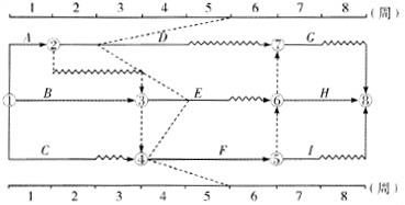 问题 某工程双代号时标网络计划执行到第5周末时,实际进度前锋线如下图所示。从图中可以看出()