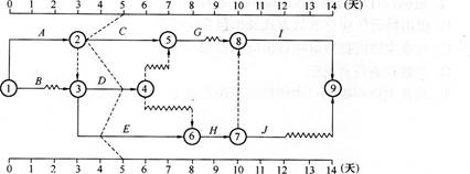 问题 某分部工程时标网络计划如下图所示。当该计划执行到第五天结束时检查实际进展情况,实际进度前锋线表明(  )。
