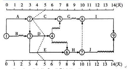 问题 某分部工程时标网络计划如下图所示。当该计划执行到第五天结束时检查实际进展情况,实际进度前锋线表明(  )。