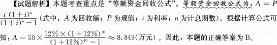 问题 某企业用50万元购置一台设备,欲在10年内将该投资的复本利和全部回收,基准收益率为12%,则每年均等的净收益至少应为(  )万元。